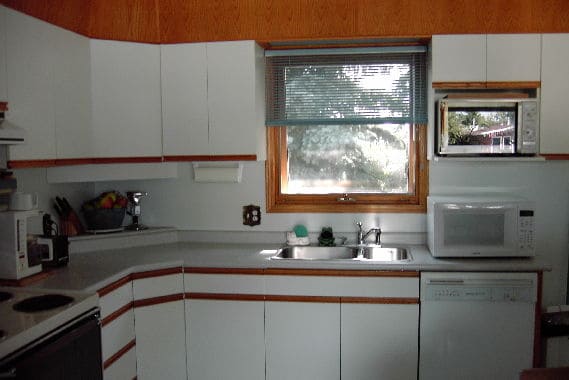 - kitchen features European style melamine cupboards with oak pulls, oak trim, Hunter Douglas blinds, sink-and-a-half, built in dishwasher, garburator